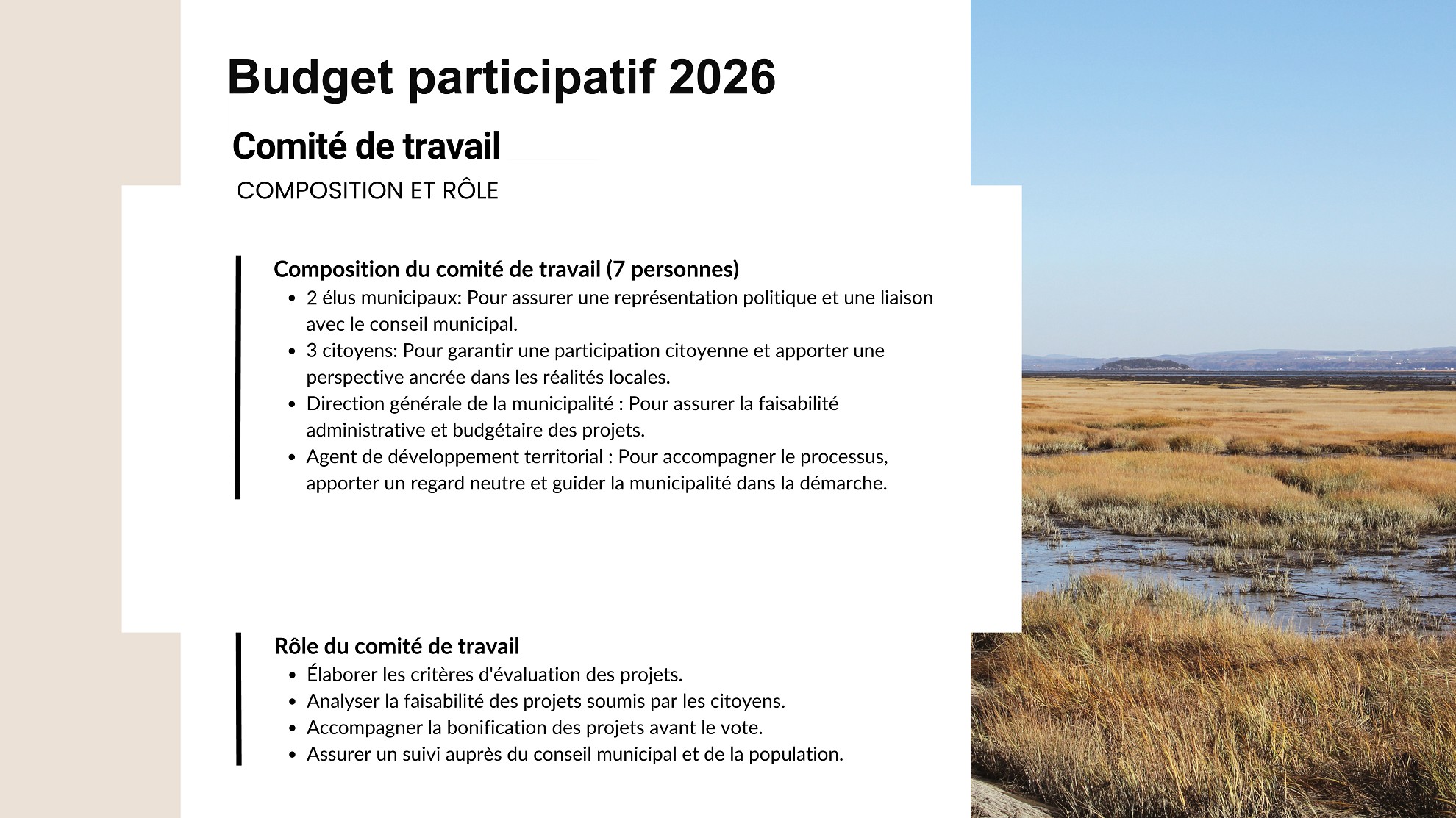 En 2026, la municipalité a décidé de mettre en place un budget participatif, une initiative visant à impliquer activement les résidents : chaque citoyen aura l’opportunité de soumettre ses idées et de voter pour la réalisation de projets améliorant notre cadre de vie. Le budget alloué s’élève à 2 500 $. La prochaine étape est la formation d’un comité de travail dont la composition prévoit trois citoyens (pièce jointe et ci-dessous). Merci de me confirmer votre intérêt à siéger sur ce comité au plus tard le 2 mars prochain.